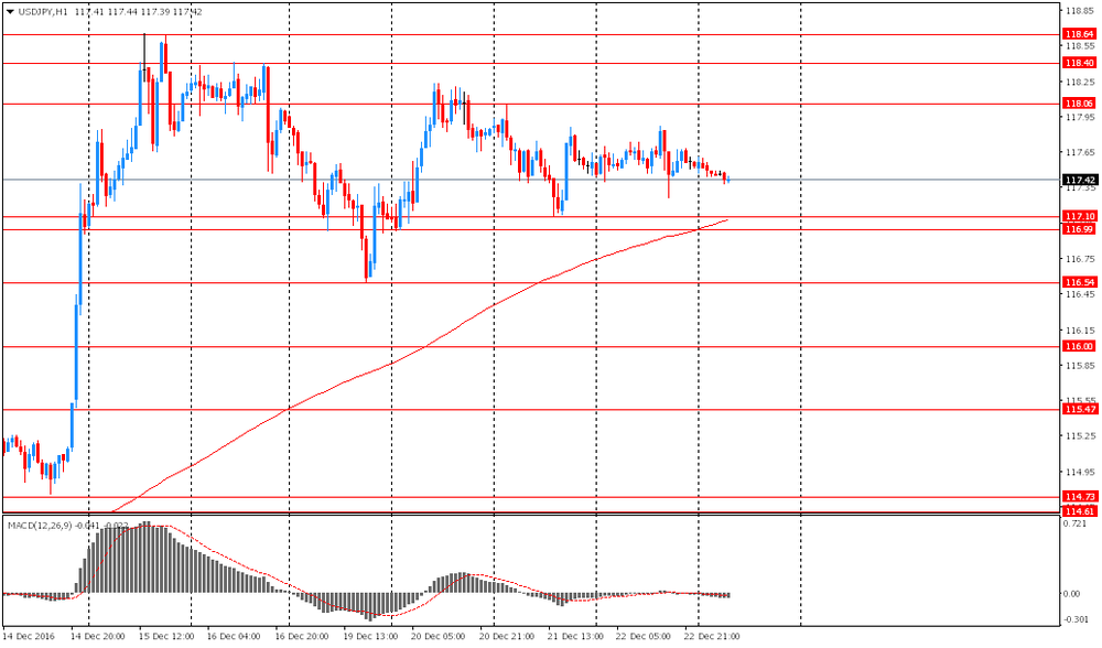 USD/JPY: в ходе азиатской сессии пара упала немного снизилась к Y117.30. Пара продолжает оставаться в коррекционной фазе в форме флета. В условия низкой ликвидности (тонкого рынка) лучше не входить в позиции. Ближайшей поддержкой, которой будет ограничена коррекция выступает область минимумов 20 и 21 декабря: Y117.00-10.