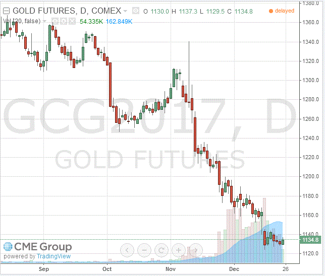 Цены на золото обвалились более чем на $200 за унцию после президентских выборов в США, и на прошлой неделе достигли минимума на уровне $1122.35, поскольку победа Трампа вызвала ралли доллара и значительное повышение доходности американских облигаций. В этом квартале стоимость золота уменьшилась на 14 процентов, сократив свой годовой прирост до 6,7 процента.