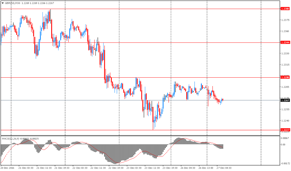 GBP/USD: в ходе азиатской сессии пара торговалась в диапазоне $1.2260-85. Фунт второй день торгуется очень вяло и без существенных изменений по причине низкого объема торгов, в связи с Рождественскими праздниками. Стоит отметить, что сегодня в Великобритании выходной и вряд ли британская валюта покажет импульсное движение. Следовательно торговлю лучше вести с короткими целями.