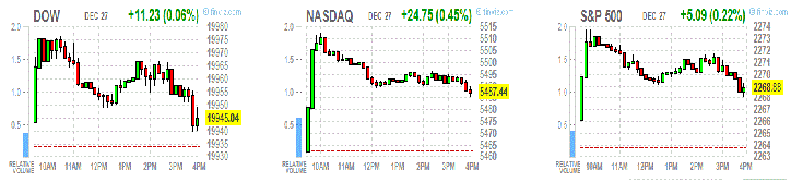 Основные фондовые Уолл-стрит закрылись чуть выше нуля во вторник, Dow Jones Industrial Average возобновил свое ралли к отметке 20000, а Nasdaq ударил рекордную отметку на фоне роста акций технологического сектора. Тем не менее, активность участников рынка и объемы торгов остаются низкими в преддверии новогодних выходных.