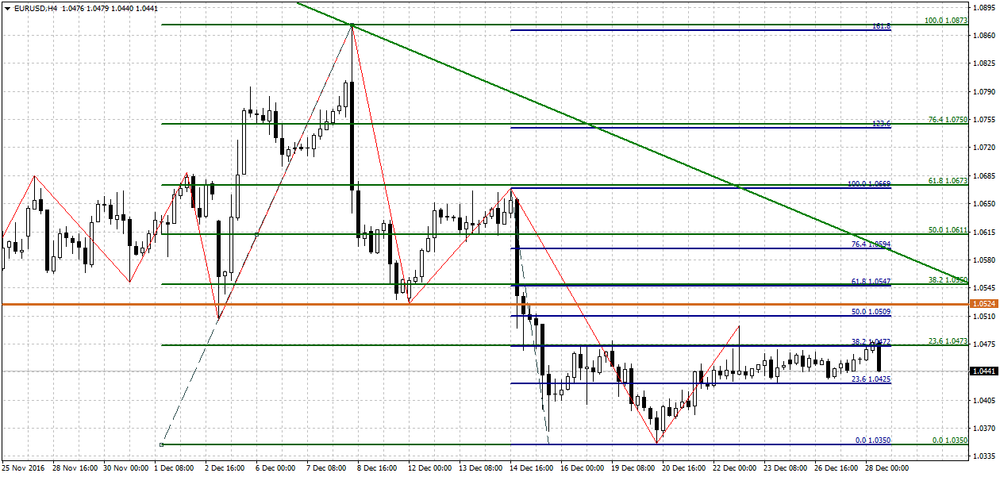 Первая исключительно сильная реакция евро/доллара на победу Д.Трампа и повышение ставки ФРС отыгрывалась рынком в ноябре-декабре. Результат - снижение почти на 1000 пунктов, с 1,13 до 1,0350, пробитие вниз важнейших многомесячных уровней поддержки. Но дальше будет важно, как в реальности станут осуществляться обещания нового президента после вступления в должность 20 января. Рынок замер на высоких уровнях доллара накануне Нового года. Индекс доллара DX - на уровне 103 п., вблизи многолетних максимумов. Доходность американских облигаций держится выше 2,5% и всё ещё растёт, в отличие от германских, дающих лишь 0,2%. Так что пока есть все основания предполагать продолжение роста доллара в следующем году.