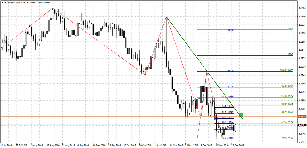 Первая исключительно сильная реакция евро/доллара на победу Д.Трампа и повышение ставки ФРС отыгрывалась рынком в ноябре-декабре. Результат - снижение почти на 1000 пунктов, с 1,13 до 1,0350, пробитие вниз важнейших многомесячных уровней поддержки. Но дальше будет важно, как в реальности станут осуществляться обещания нового президента после вступления в должность 20 января. Рынок замер на высоких уровнях доллара накануне Нового года. Индекс доллара DX - на уровне 103 п., вблизи многолетних максимумов. Доходность американских облигаций держится выше 2,5% и всё ещё растёт, в отличие от германских, дающих лишь 0,2%. Так что пока есть все основания предполагать продолжение роста доллара в следующем году.