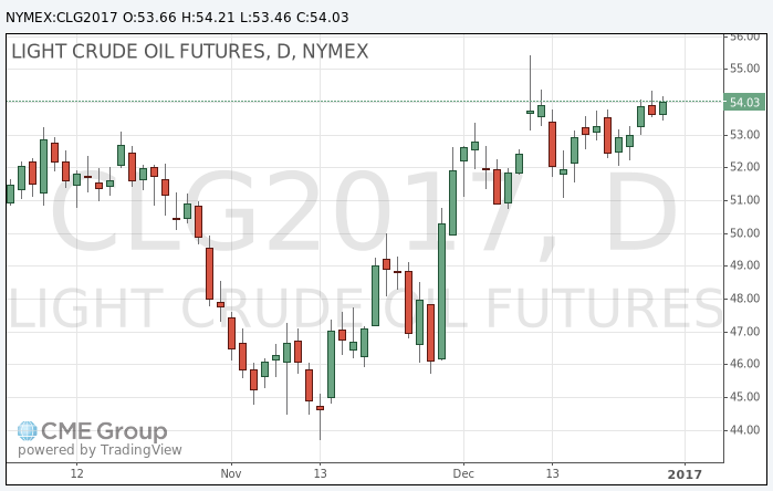 Стоимость февральских фьючерсов на американскую легкую нефть марки WTI (Light Sweet Crude Oil) выросла до 54,21 доллара за баррель на Нью-йоркской товарно-сырьевой бирже.