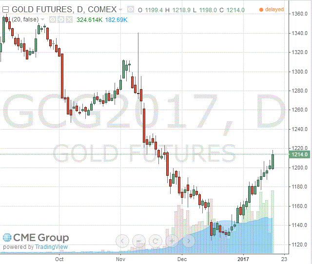 Кроме того, повышению цен на золото способствует неопределенность касательно планов Трампа для экономики США после его инаугурации, которая запланирована на эту пятницу. Напомним, кампания Трампа предусматривает снижение налогов и увеличение расходов на инфраструктуру, что должно поддержать рост экономики и курса доллара, но его протекционистские заявления и шквал неоднозначных твитов вынудили инвесторов отказаться от увеличения рисковых позиций, и сосредоточить свое внимание на безопасных активах, до которых традиционно относится золото.