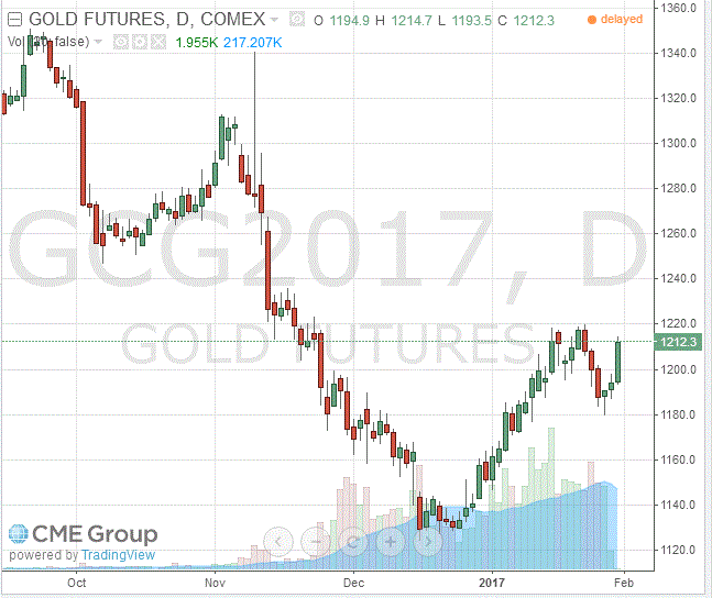 Cтоимость февральского фьючерса на золото на COMEX выросла до $1212,3 за унцию.