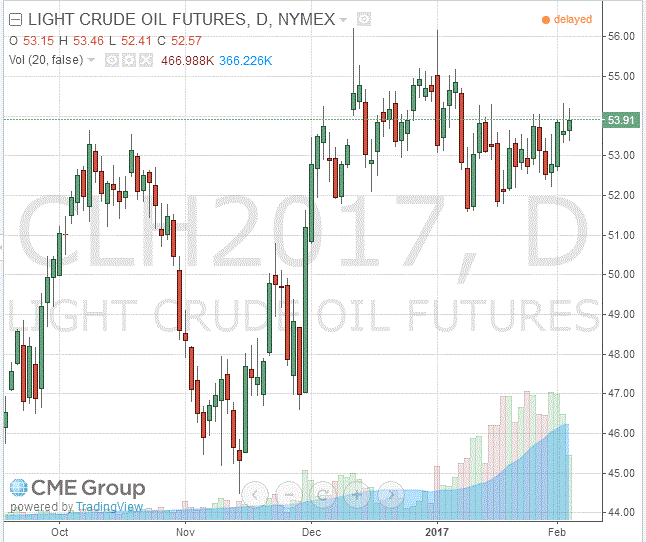 Стоимость мартовских фьючерсов на американскую легкую нефть марки WTI (Light Sweet Crude Oil) выросла до 53,91 доллара за баррель на Нью-йоркской товарно-сырьевой бирже.