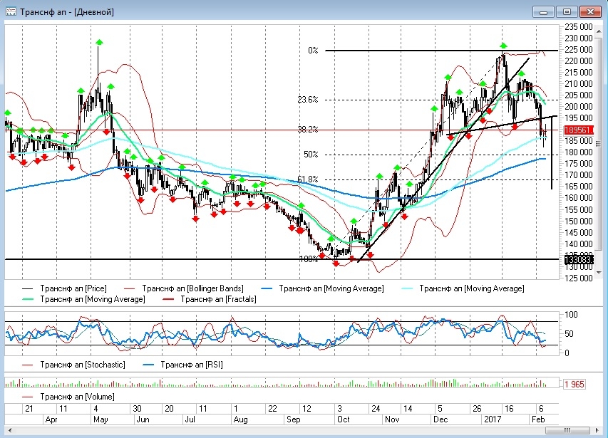 Итак, акции «Транснефти-ап» уже вернулись к уровню 189100 рублей. Рост с уровня 132600 до 225000 рублей, уже скорректирован на 38,2%. На текущих рубежах котировки нащупали поддержку как в лице медленной скользящей средней ЕМА100 на днях, так и в лице ЕМА21 на неделях. Прорыв уровня 185-185,5 тыс. рублей вниз даст толчок к новым продажам, которые могут привести бумаги в район в район 165-168 тыс. рублей.