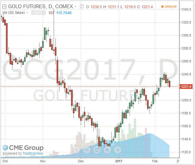 На динамику торгов также влияют ожидания выступления главы Федеральной резервной системы США Йеллен. Во вторник Йеллен выступит перед банковским комитетом Сената, а в четверг - перед комитетом по финансовым услугам Палаты представителей. Она может использовать эту возможность, чтобы рассказать о последних изменениях в экономике и планах центрального банка относительно процентных ставок. Если комментарии главы ФРС будут "ястребиными", участники рынка могут пересмотреть свои ожидания касательно ужесточения денежно-кредитной политики ФРС. Согласно рынку фьючерсов, сейчас вероятность повышения ставки ФРС на мартовском заседании составляет 17,7% по сравнению с 13,3% днем ранее. Напомним, золото обычно дешевеет при росте ставок, поскольку оно не приносит процентного дохода и становится в этом случае менее востребованным по сравнению с активами, такой доход приносящими.