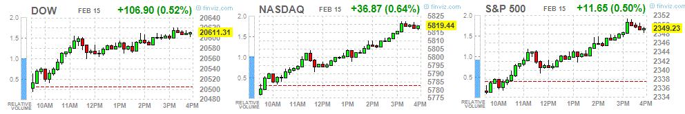 Основные фондовые индексы Уолл-стрит завершили торги в плюсе, записав пятое сессионное повышение подряд, после того, как президент Дональд Трамп повторил свое обещание сократить налоги, а также благодаря оптимистичным экономическим данным, которые увеличили шансы повышения ставки и подняли акции банков.