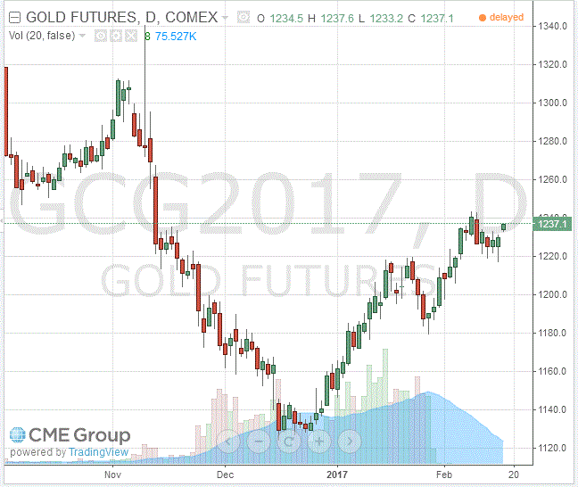 Cтоимость апрельского фьючерса на золото на COMEX выросла до $1237,1 за унцию.