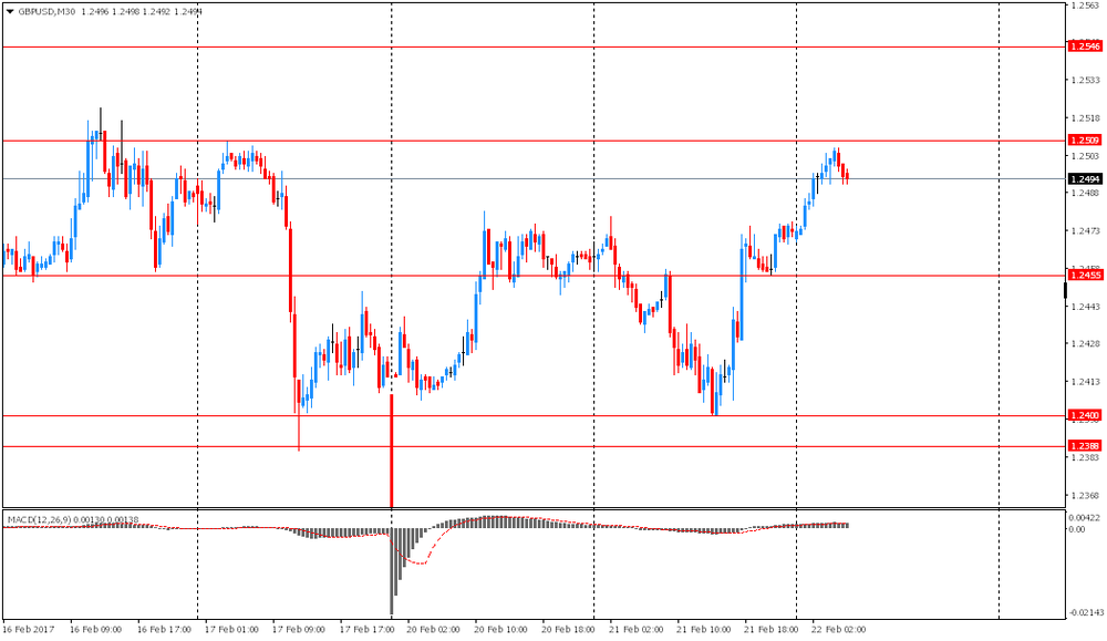 GBP/USD: в ходе азиатской сессии пара выросла к $1.2505. Пара полностью восстановилась после пятничного падения. Тем не менее, пара находится в нисходящем тренде с начала февраля. Ближайшим сопротивлением может выступить область максимумов 14-16 февраля.