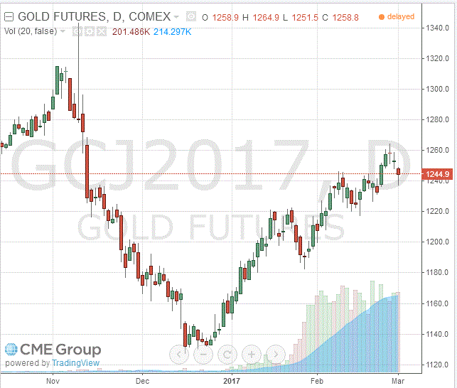 Cтоимость апрельского фьючерса на золото на COMEX снизилась до $1244,90 за унцию.