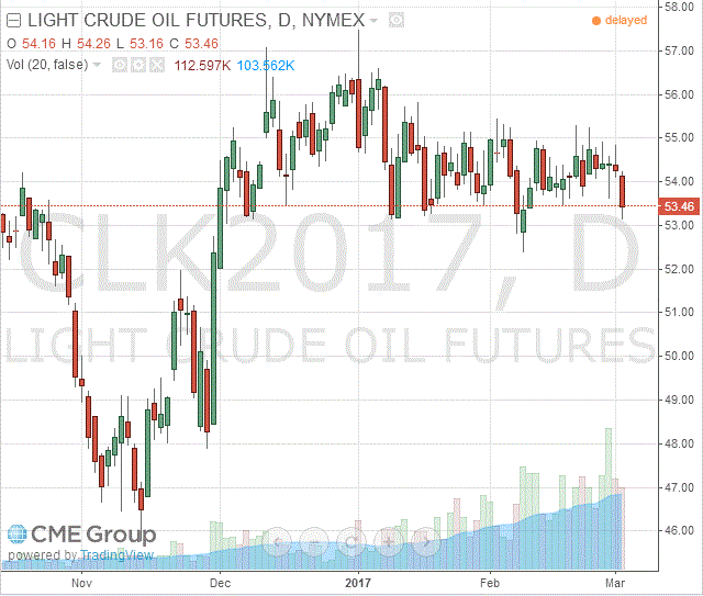 Стоимость апрельских фьючерсов на американскую легкую нефть марки WTI (Light Sweet Crude Oil) упала до 53,46 доллара за баррель на Нью-йоркской товарно-сырьевой бирже.