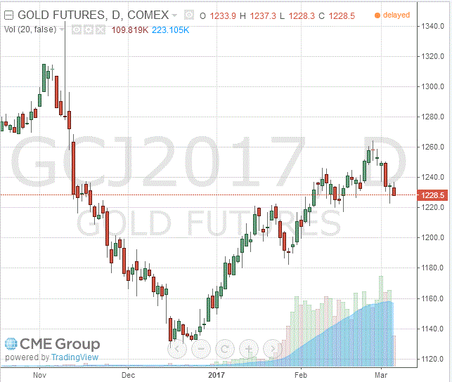 Стоимость апрельского фьючерса на золото на COMEX снизилась до $1228,50 за унцию.