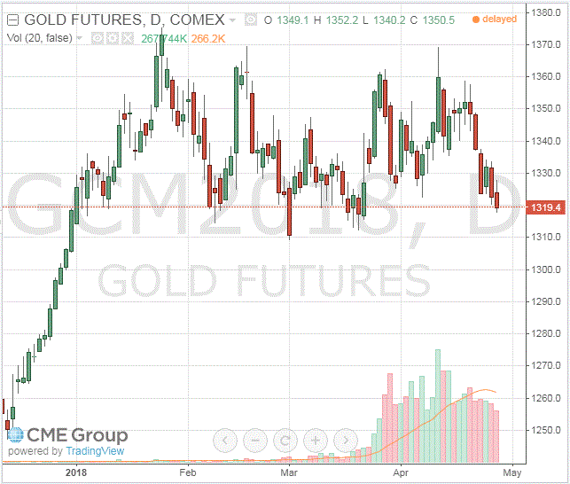 Золото удерживается в торговом диапазоне между примерно $1360 и $1310 с момента достижения 1,5-летнего максимума на уровне $1366.07 в январе. Драгметалл поддерживается геополитической неопределенностью, которая усиливает спрос на золото в качестве актива-убежища, но дальнейший рост цен сдерживается опасениями повышения процентных ставок в США, что увеличит доходность облигаций и укрепит доллар США.