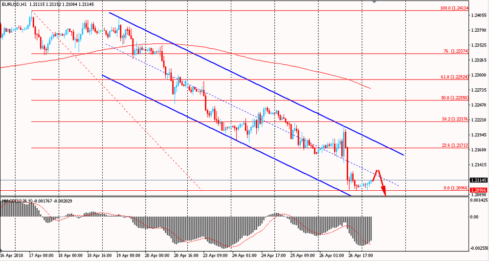 Пара EUR/USD сегодня утром торговалась в диапазоне $1.2095-10, удерживаясь на вчерашних минимумах. В четверг евро, оттолкнувшись от линии сопротивления нисходящего канала, сформировало очередной нисходящий импульс и закрыла день на отрицательной территории. На текущий момент пара все еще торгуется ниже уровня скользящей средней MA 200 H1 и находится около срединной линии нисходящего канала от 19 апреля.