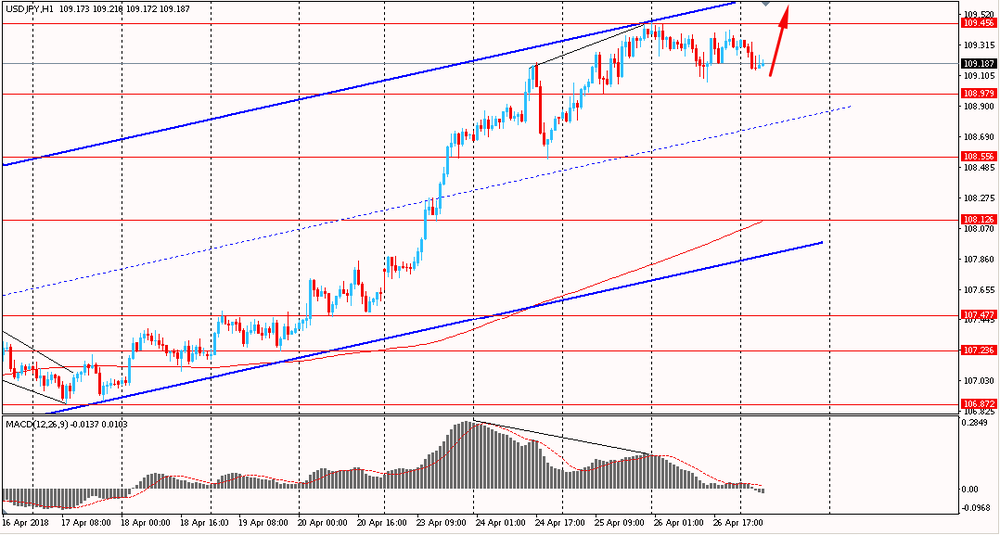 Сегодня пара USD/JPY торговалась в диапазоне Y109.15-35, удерживаясь на недельных максимумах. В четверг пара торговалась без существенных изменений и находилась у линии сопротивления восходящего канала. Помимо этого, пара по-прежнему торгуется выше линии скользящей средней MA 200 H1 и находится под полным контролем быков.