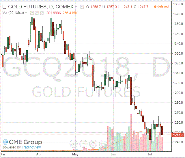 Стоимость августовского фьючерса на золото на COMEX снизилась до $1247,70 за унцию.