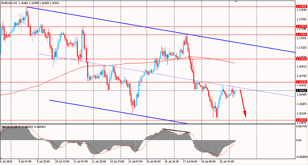 Пара EUR/USD сегодня утром торговалась в диапазоне $1.1640-55. Вчера пара снижалась в первой половине дня, однако, нашла сильную поддержку на уровне $1.1600 и к закрытию дня восстановила часть позиций. На данный момент единая валюта снова торгуется ниже линии скользящей средней MA 200 H1, в общем нисходящем тренде от 9 июля. Вчера и сегодня евро тестирует срединную линию этого канала. В любом случае, пока пара находится в рамках данной медвежьей тенденции, безопасней присматриваться к продажам.