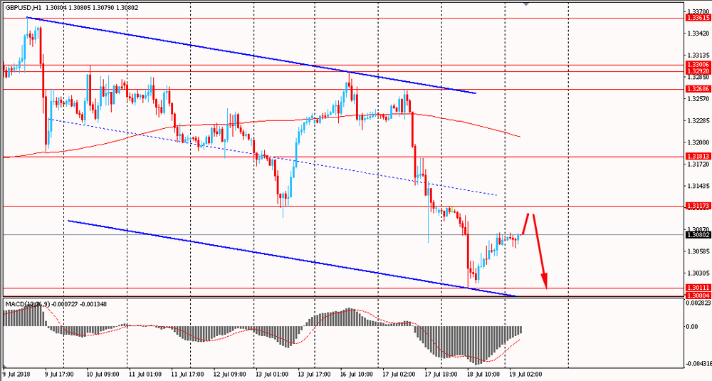 Пара GBP/USD сегодня утром торговалась в диапазоне $1.3065-80, оставаясь около недельных минимумов. В среду пара стремительно снижаться в первой половине дня, однако, потом оттолкнулась от линии поддержки нисходящего канала и к окончанию торгов немного скорректировалась. На данный момент пара находится в нижней части глобального медвежьего канала от 9 июля, ниже линии сопротивления скользящей средней MA 200 H1, под контролем медведей. В данной ситуации наиболее уместным будет искать точки входа на продажу, по тренду.