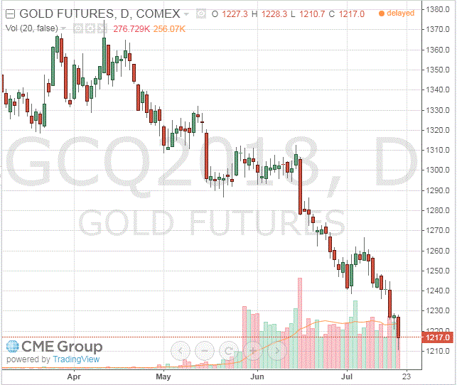 Стоимость августовского фьючерса на золото на COMEX упала до $1217,00 за унцию.