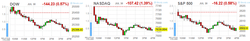 Основные фондовые индексы США заметно снизились, так как разочаровывающие прогнозы от технологических и интернет-компаний вызвали беспокойство по поводу продолжающегося роста высокотехнологичного сектора.