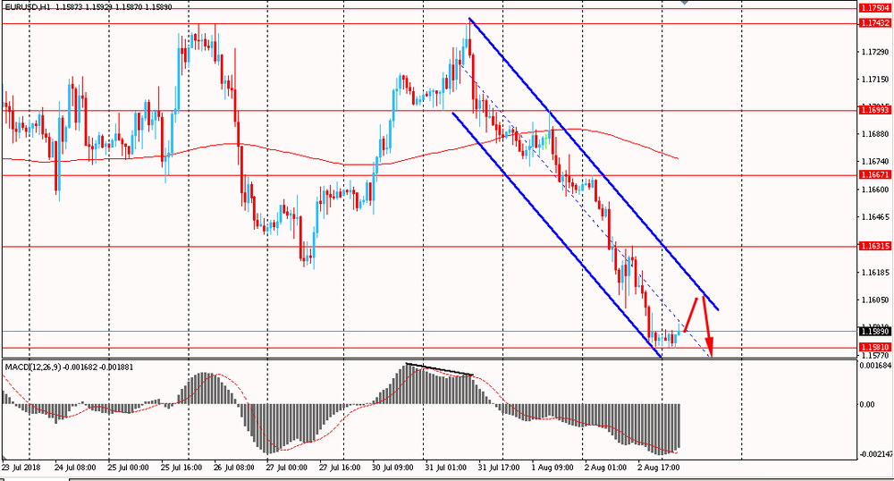 Пара EUR/USD сегодня утром торговалась в диапазоне $1.1580-90, оставаясь около вчерашних минимумов. В четверг пара, оттолкнувшись от линии сопротивления нисходящего канала от 31 июля, упала и закрыла очередной день на отрицательной территории. На данный момент единая валюта продолжает оставаться под давлением и удерживается ниже линии скользящей средней MA 200 H1. Евро находит в нисходящем даунтренде. Стоит отметить, пока пара будет торговаться ниже MA 200 H1, логичным будет присматриваться к продажам евро на коррекциях.